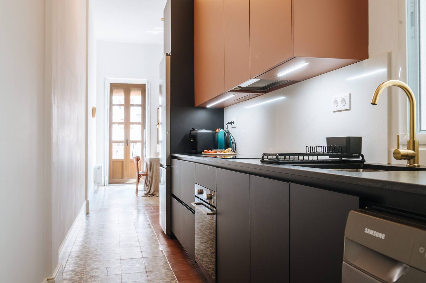 La cocina diseñada para disfrutar tanto preparando un snack y un vino mientras se disfruta del la música del salón (Nest mini) o para cocinar tus mejores platos. Horno digital y placa de inducción.